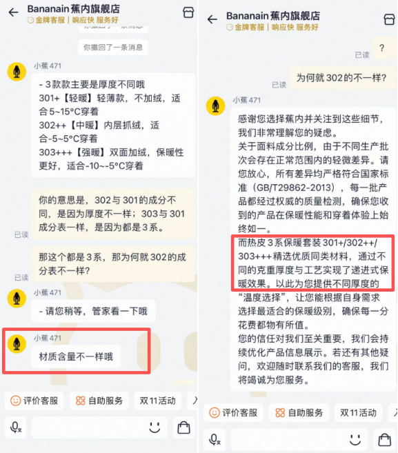 究竟是商品宣传页标注有误,还是商品质量存在问题?网友们吵开了锅,希望得到品牌方的正面回应。然而,当有消费者咨询Bananain蕉内旗舰店时,人工客服竟“泄露”了公司内部要求使用统一“话术”回应当前争议。“难道公司明知商品有问题,却只想用‘话术’应付?”该消费者对此满是疑惑。