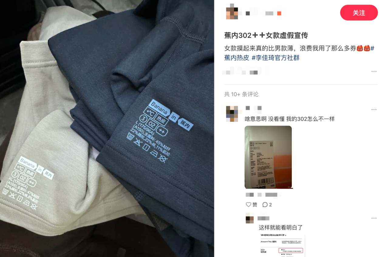 “太糟心了!蕉内中热皮女保暖衣摸起来比男式同款薄,还浪费那么多券”“第一次知道含量还能‘造假’”……近日,不少消费者反映,他们在李佳琦直播间购买的蕉内品牌中热皮保暖内衣实物与宣传页面的成分参数标注不同,与价格更低的轻热皮保暖衣一样。更反常的是,男士中热皮保暖衣实物与宣传成分一致,仅女款出现偏差,有消费者直言“女款手感明显更薄”。