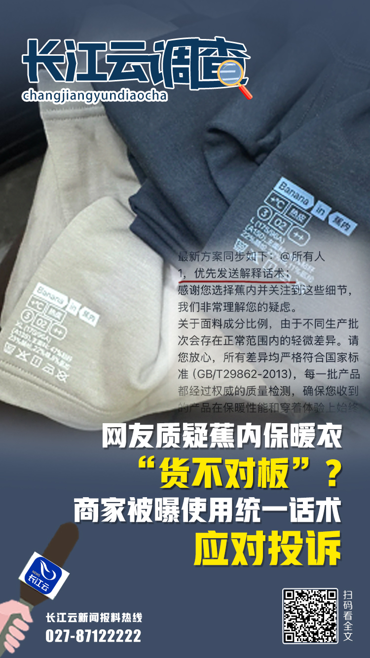 长江云调查丨网友质疑蕉内保暖衣“货不对板”?商家被曝使用统一话术应对投诉