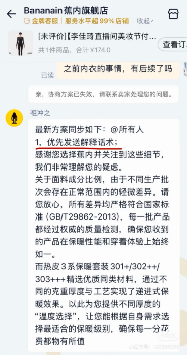 近日,多名消费者在社交平台上爆料,“双11”期间通过李佳琦直播间购买的蕉内品牌保暖内衣存在“货不对板”问题,其实际成分与宣传参数不一致。当消费者就此与商家客服进行交涉时,对方意外泄露了内部的“话术本”,其中明确要求“优先使用解释话术”来应对投诉。