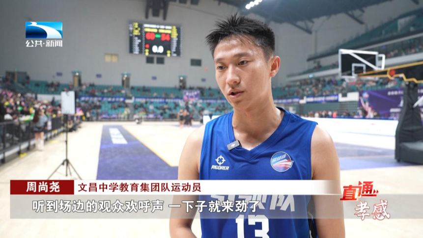 文昌中学教育集团队运动员 周尚尧:听到场边的观众欢呼声一下子就来劲了,我们队都是老师,平常站在讲台上,现在站在球场上,也要努力拼搏,为学生做好榜样。