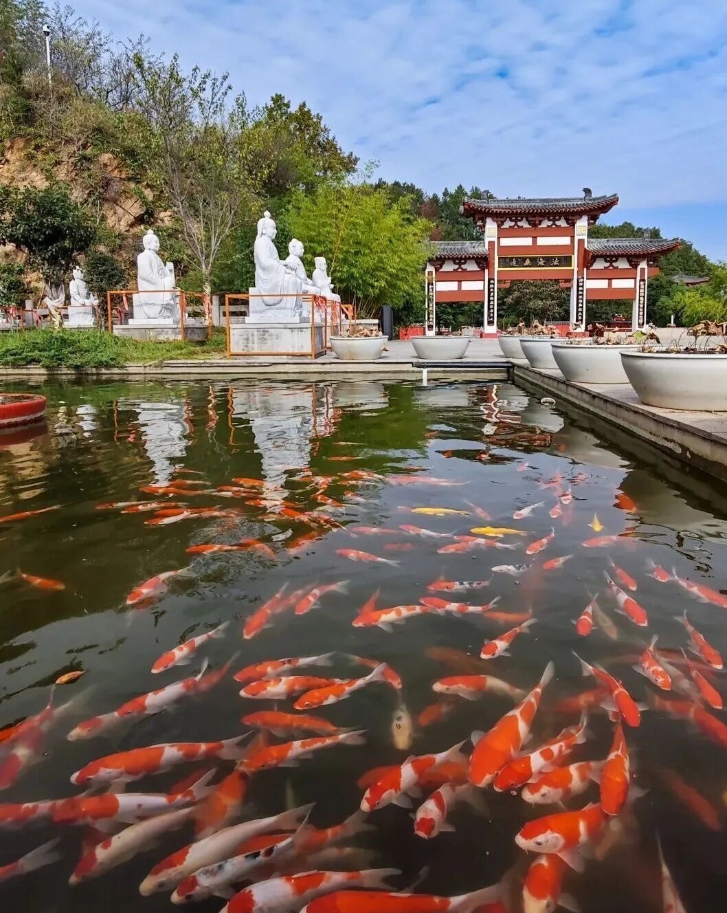 飞檐挑起晨光,连廊牵系流云。锦鲤在清池里划出清辉,苍松翠竹映着红墙黛瓦。