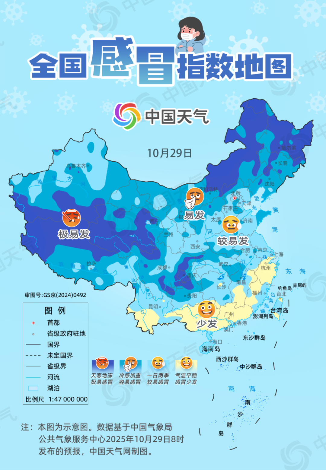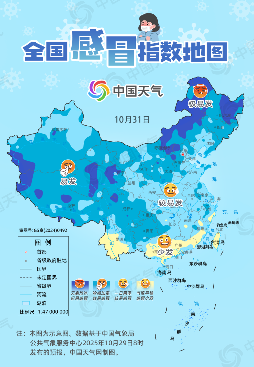 10月31日,北方大部感冒风险仍处于易发水平,且四川盆地、贵州等地降雨范围扩大,在雨水打压下,冷感加重,也易感冒。河北、河南、江苏、安徽等地昼夜温差较大,部分地区可超10℃。