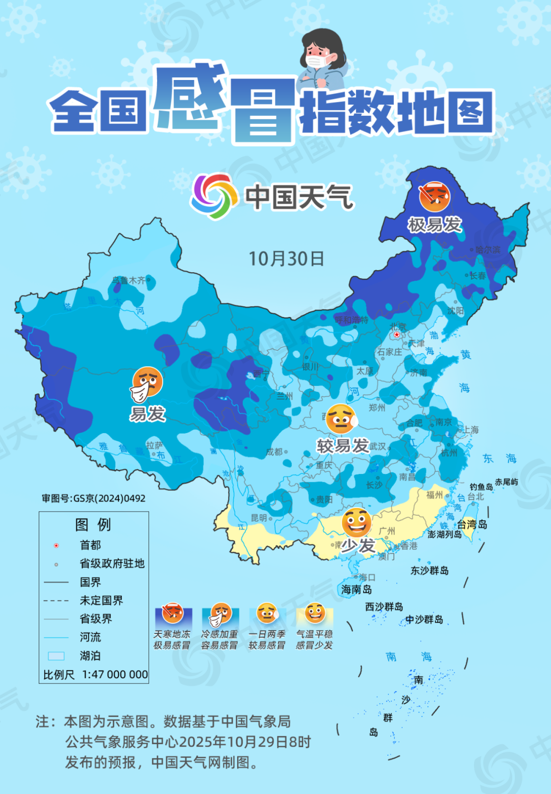 10月30日起,受冷空气影响,北方多地将迎明显降温,南方降水增多气温也将走低,易感冒区域有所扩大。不仅华北北部、西北地区、东北地区大部等地易引发感冒,江苏、上海、浙江的部分地区和湖南等地也将加入容易感冒的行列。长沙今天最高气温将降至17℃,再加上有雨水相伴,湿凉明显,易引发感冒。