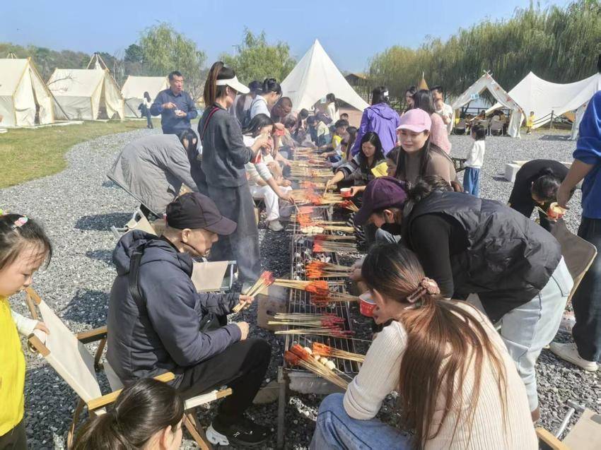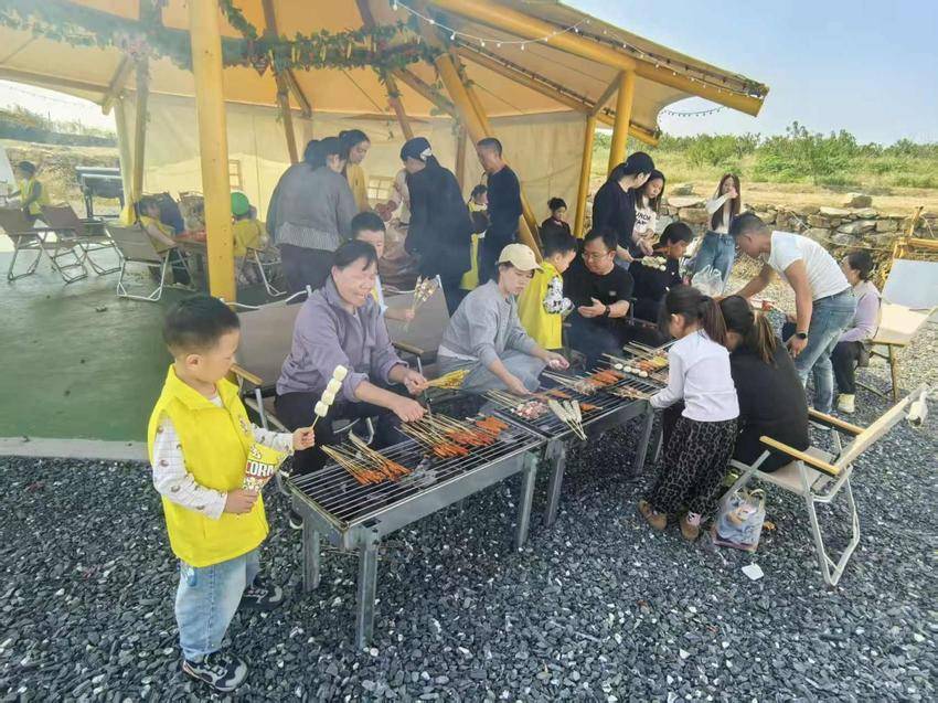 随后,亲子们纷纷走向各自的露营帐篷区域,不少家庭提前备齐露营装备,在帐篷里铺设野餐垫,摆放着水果、点心与饮品,在帐篷外,家长在便捷小火炉上正兴致勃勃地动手烤肉,大人孩子围坐在一起分享美食,享受难得的惬意时光。