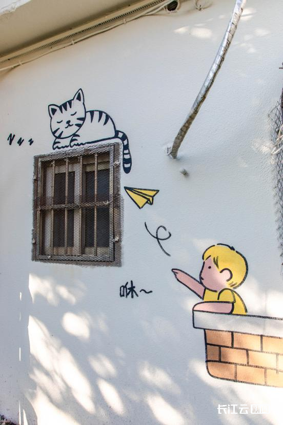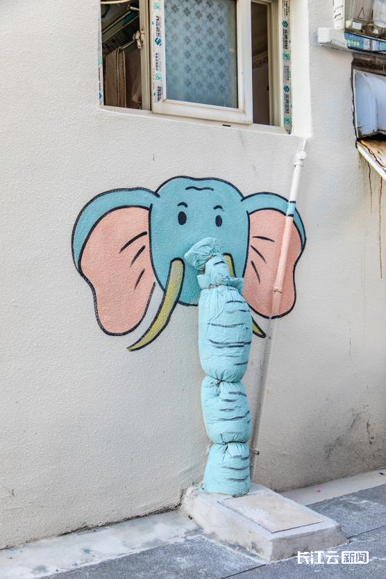 从三道街考拉食堂沿着小巷拾级而上,每一个不经意的转角,都能邂逅惊喜的景致:被包裹的管道绘制成了大象鼻子;窗边的小孩朝着熟睡的猫咪掷出纸飞机;挂在墙上的管线摇身化作三只小猫的独木桥;汤姆和杰瑞藏在一个不起眼的石墩两侧……