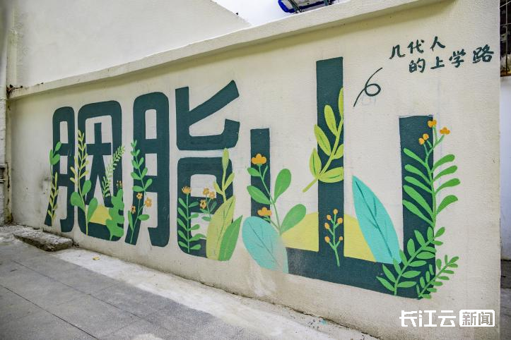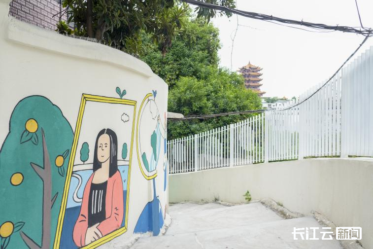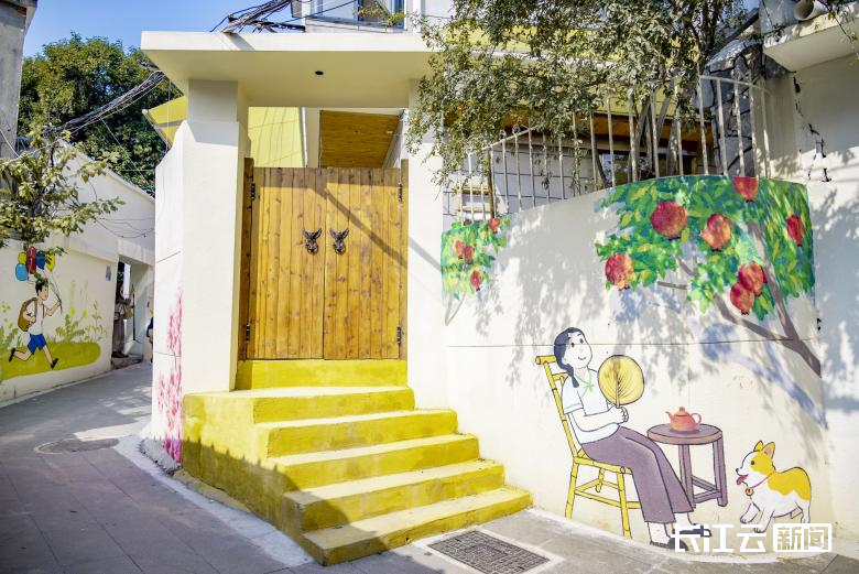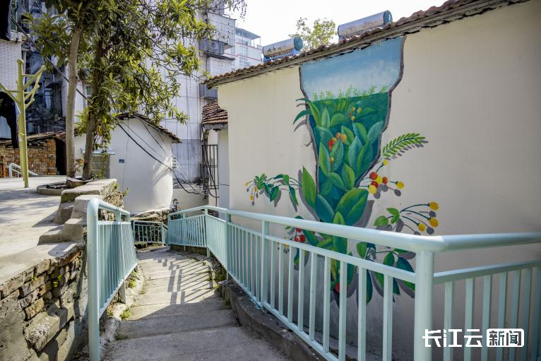 沿山道拾级而上,统一涂装为霜绿色的扶手栏杆,以及充满童趣的墙绘,为老巷增添了清新活力,仿佛置身于漫画世界,令人不禁驻足拍照。胭脂山半山腰,一处居民院的外墙上绘有石榴树,石榴树下主人与小狗其乐融融的画面,为整面漫画墙增添了许多温馨与趣味,吸引了不少游客驻足打卡。院子主人阿成介绍,项目方施工设计时,施工方充分考量并采纳了居民的意见,让居民心之所向成为现实,让几十年老街巷焕发新活力,变成了“新”社区。