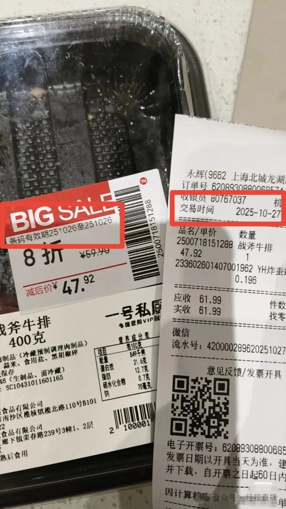 10月29日,经视直播报道上海宝山区龙湖永辉超市“过期折扣条码仍可使用”一事引发关注。有消费者反映,在该店购买400克战斧牛排时,发现外包装标注“有效期仅10月26日一天”的8折条码,在10月27日仍成功以折扣价结算,质疑其涉嫌虚假促销。