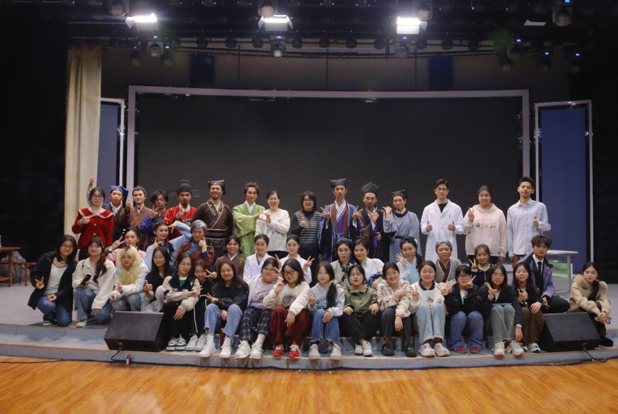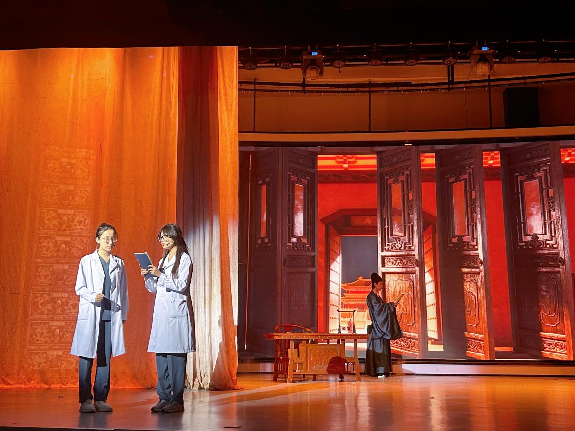 舞台呈现上,设计团队通过灯光与幕布的创新运用实现古今场景自然转换。负责舞美的吴晓婉同学透露,序幕场景中,通过纱布的层次控制让现代实验室与明代书斋同框呈现,营造出穿越时空的沉浸式视觉体验。