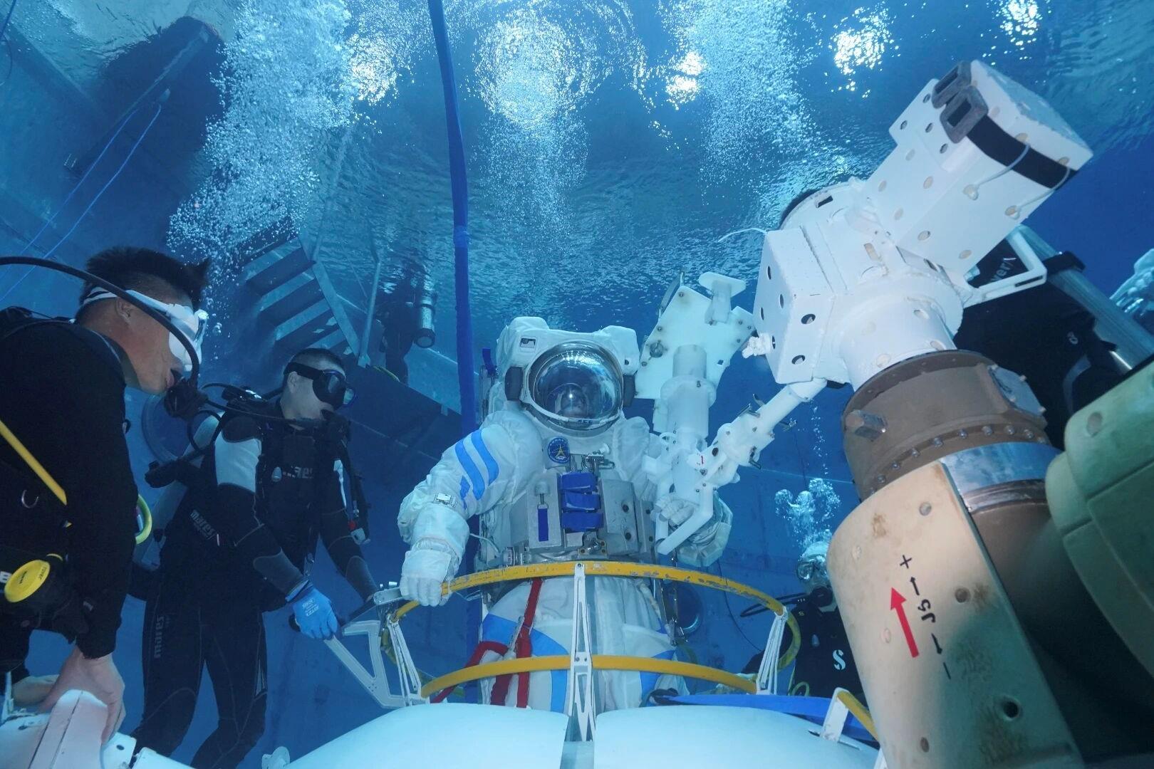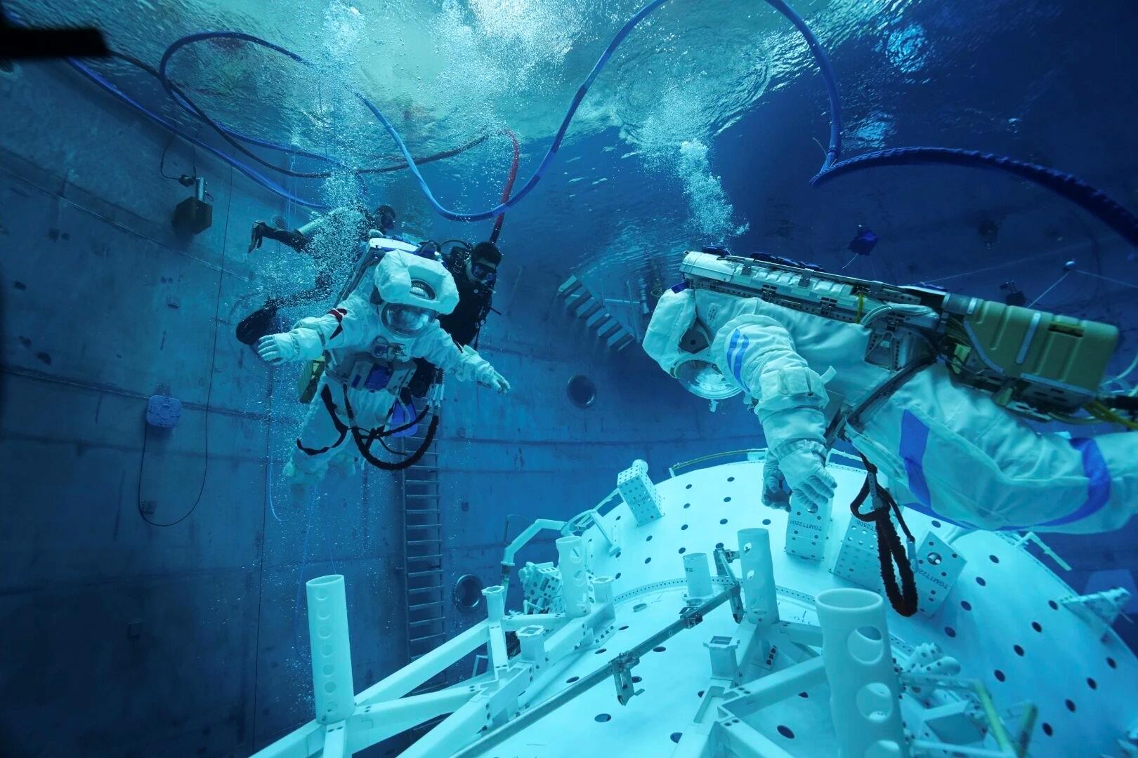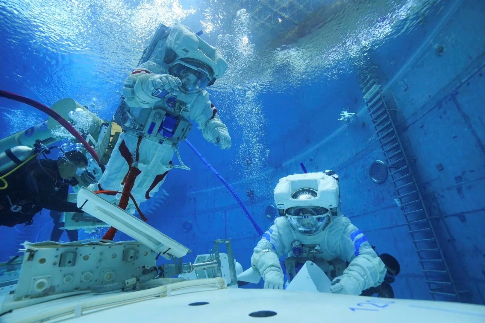 △航天员乘组在进行水下出舱活动训练