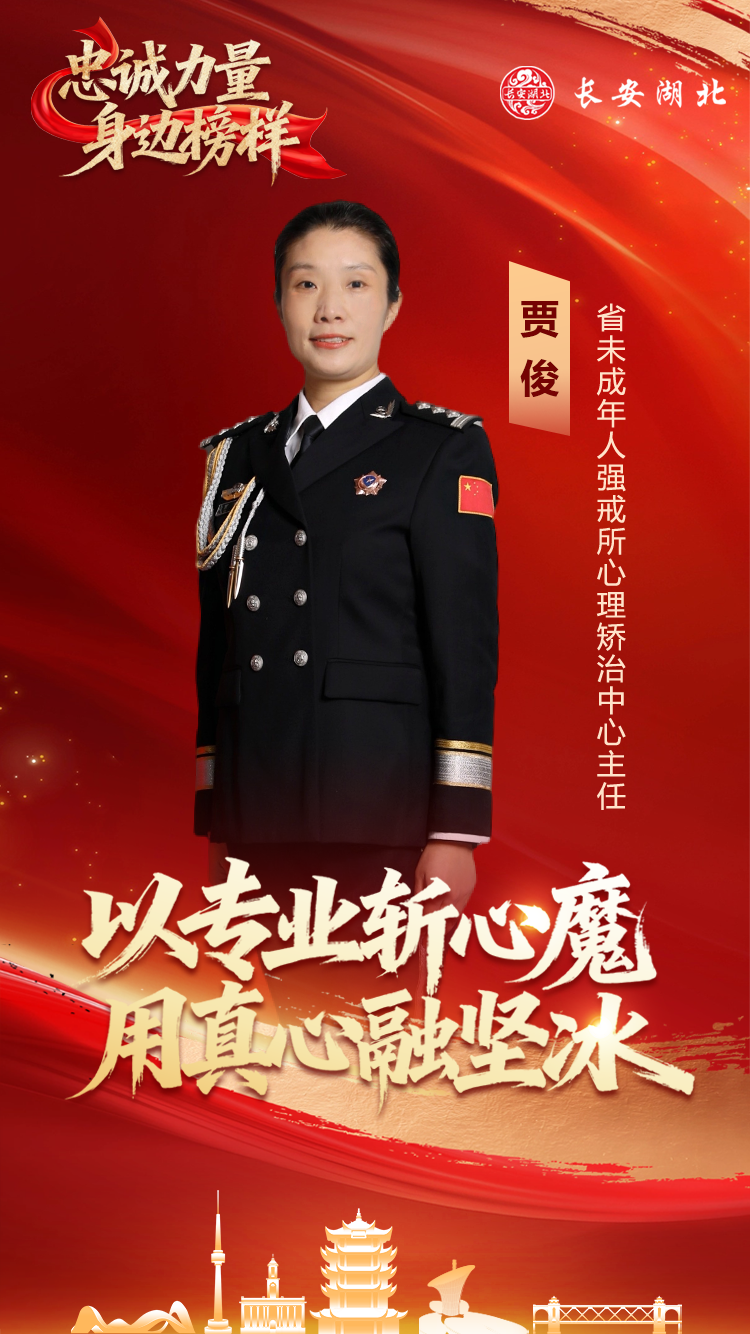贾俊,女,1976年1月出生,湖北省未成年人强制隔离戒毒所心理矫治中心主任、一级警长、全国司法行政戒毒系统心理矫治专家,司法部全国司法行政戒毒系统宣传工作人才库成员。先后被评为司法部最美法律服务人、最美戒毒警察,湖北省“三八红旗手”标兵、湖北省“巾帼建功”标兵,湖北省“十行百佳”女能手。曾上榜荆楚楷模月度人物,获湖北省司法行政系统心理技能大赛第一名。