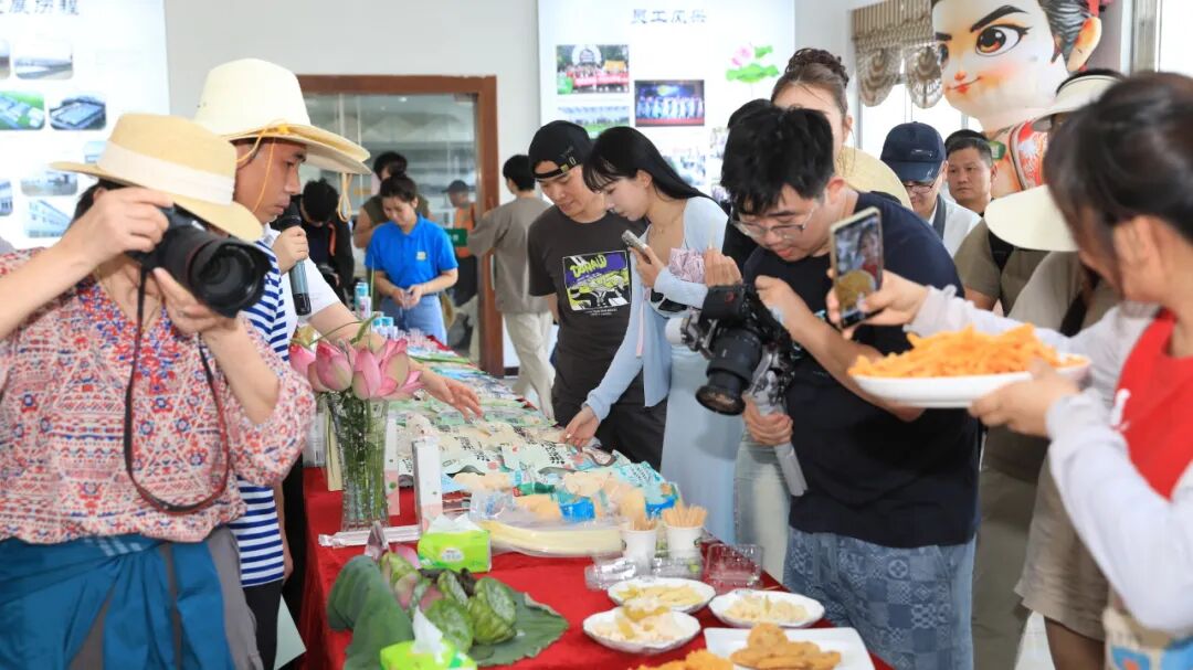洪湖市举办的一系列文旅活动则让洪湖莲藕的流量落地生根。打造“赏荷花、摘莲蓬、品全藕宴”的主题旅游线路,将产业与生态体验深度绑定。在“抖音星乡村—洪湖藕直播汇”活动中,达人身着渔家服饰在藕塘体验挖藕,同期搭配《洪湖水浪打浪》实景演唱、贝雕剪纸等非遗展示,让短视频兼具“泥土气”与文化质感。