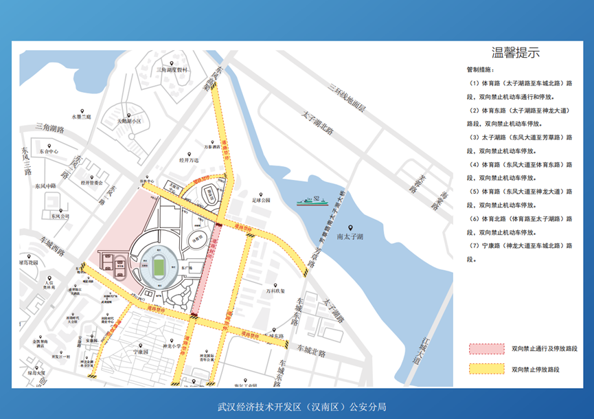 4、由于活动当日体育中心周边道路较为拥堵,货车及危化品车辆不要进入东风大道(不含)-体育路-太子湖路-芳草路(不含)-车城东路(不含)-神龙大道(不含)-东风大道(不含)合围区域内,可绕行神龙大道、车城东路等外围道路。