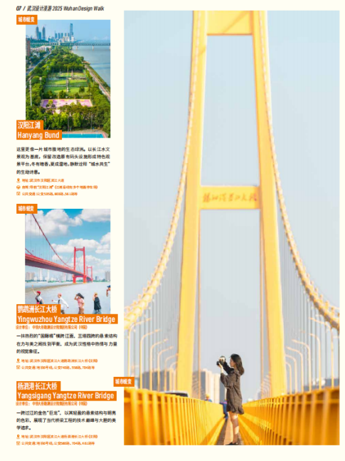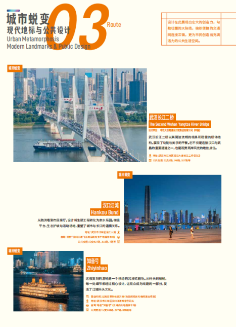“城市蜕变”路线:武汉长江二桥的简洁线条、汉口江滩的生态护坡、知音号的沉浸式码头剧场、杨泗港长江大桥的“金色巨龙”造型,既彰显了工程设计的硬核实力,也诠释了“城水共生”的设计理念。