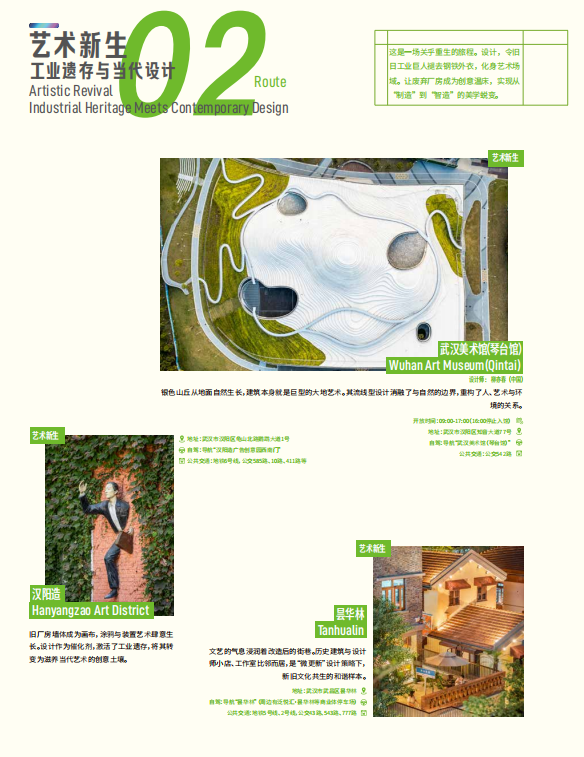 “艺术新生”路线:琴台美术馆的流线型“银色山丘”、汉阳造的涂鸦艺术厂房,在设计中活化再生的昙华林,让老旧空间变身创意温床,展现设计赋能城市重生的强大力量。这是工业遗存与当代设计完美融合的艺术场域。