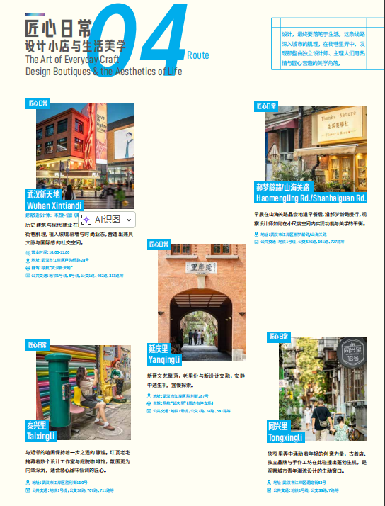 本次活动还同步发布“设计漫游” Designwalk 四大主题路线。将整座武汉变成了“流动的设计展厅”,串联起 20 多个设计地标,勾勒出城市的创意脉络。武汉设计漫游地图将同步在延庆里免费发放。