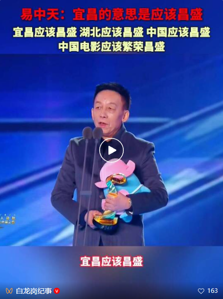 “宜昌,‘宜’意为应该,宜昌就是‘应该昌盛’,湖北应该昌盛,中国电影事业应该昌盛。”易中天对宜昌铿锵有力的解读,将这场长江文化艺术季闭幕式&2024-2025年度中国电影大数据暨电影频道M榜荣誉之夜的氛围推向了高潮。