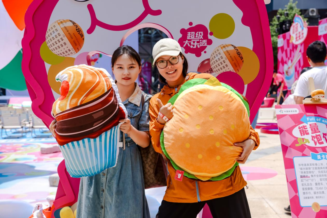 本次庆典设置三大互动游戏区,吸引市民广泛参与。在“能量饱饱站”,巨型汉堡、薯条、冰激凌等十余种创意食物玩偶与 “碳水脑袋” 头饰陈列其间,中空设计的背景墙成为热门打卡点,市民佩戴头饰、手持道具拍照打卡,完成挑战即可获得“一起”主题碎片。另一边的“超级大碗”互动区前排起长队,市民手持超长筷子尝试夹取碗中美食,不少家庭组团参与,亲子间默契配合完成挑战。而以法棍面包为球杆的创意高尔夫游戏,凭借新颖玩法收获众多年轻人青睐,现场一杆进洞的欢呼声不断,参与者表示该玩法解压又有趣,期待借此收获好运。
