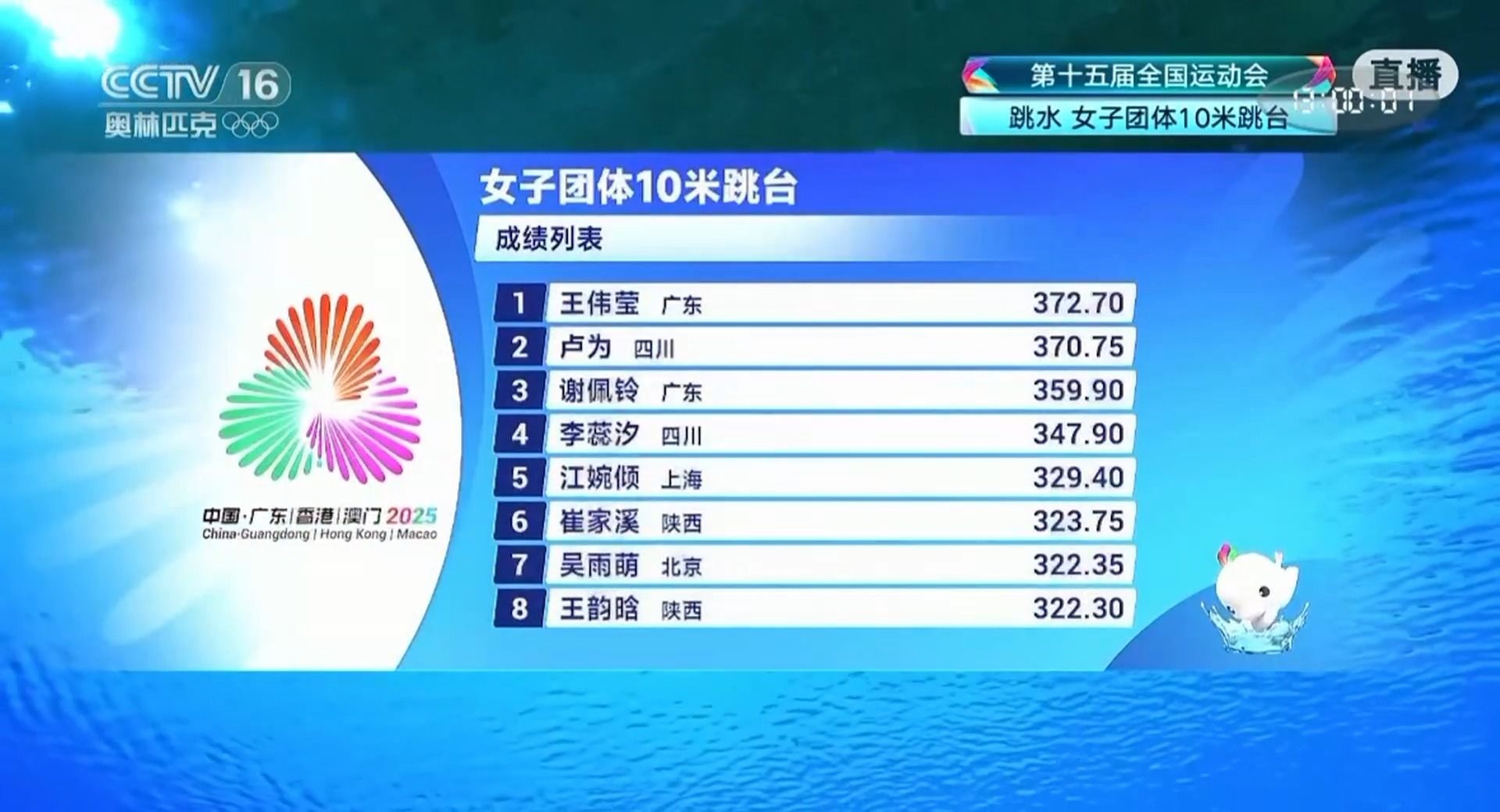 十五运跳水女团广东队领跑 全红婵今晚出战