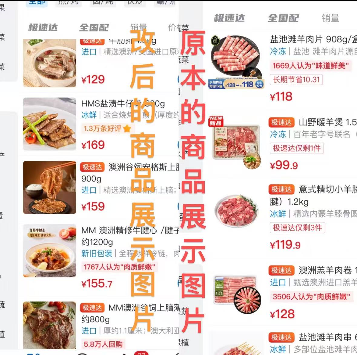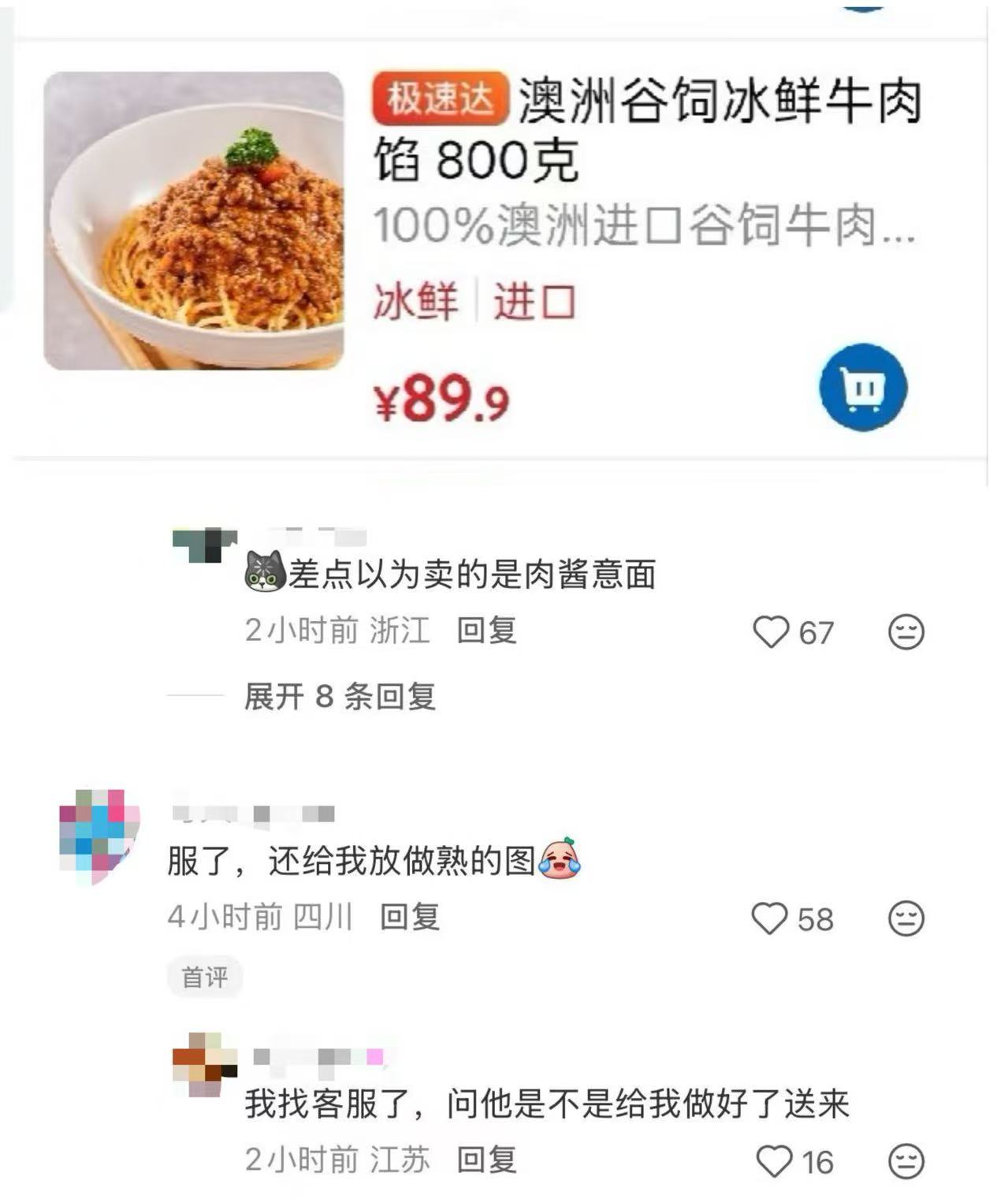 而在肉类区的浏览页面,部分产品由原本的实物白底图片,直接变成了烹饪好的“熟食”菜品。根据张女士提供的截图,在“澳洲谷饲冰鲜牛肉馅”的展示橱窗,原本的商品实物图片,变成了一碗肉酱面替代。