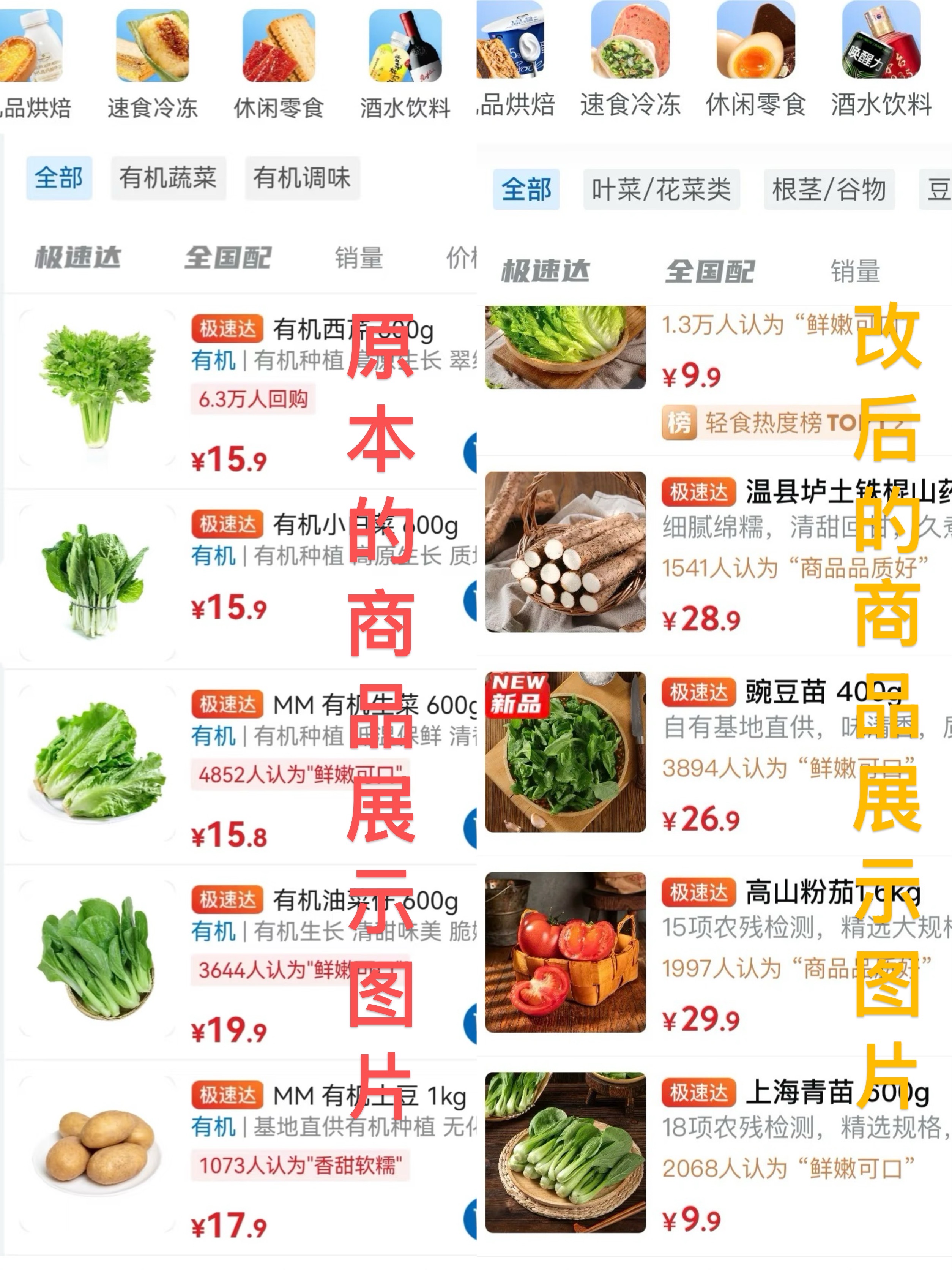 针对张女士反映的情况,长江云新闻记者在手机上打开山姆会员商店的APP浏览发现,在有机蔬菜区的浏览页面,展示图片由原本简洁明了的商品直拍,变成了精致布景的“海报”画风。