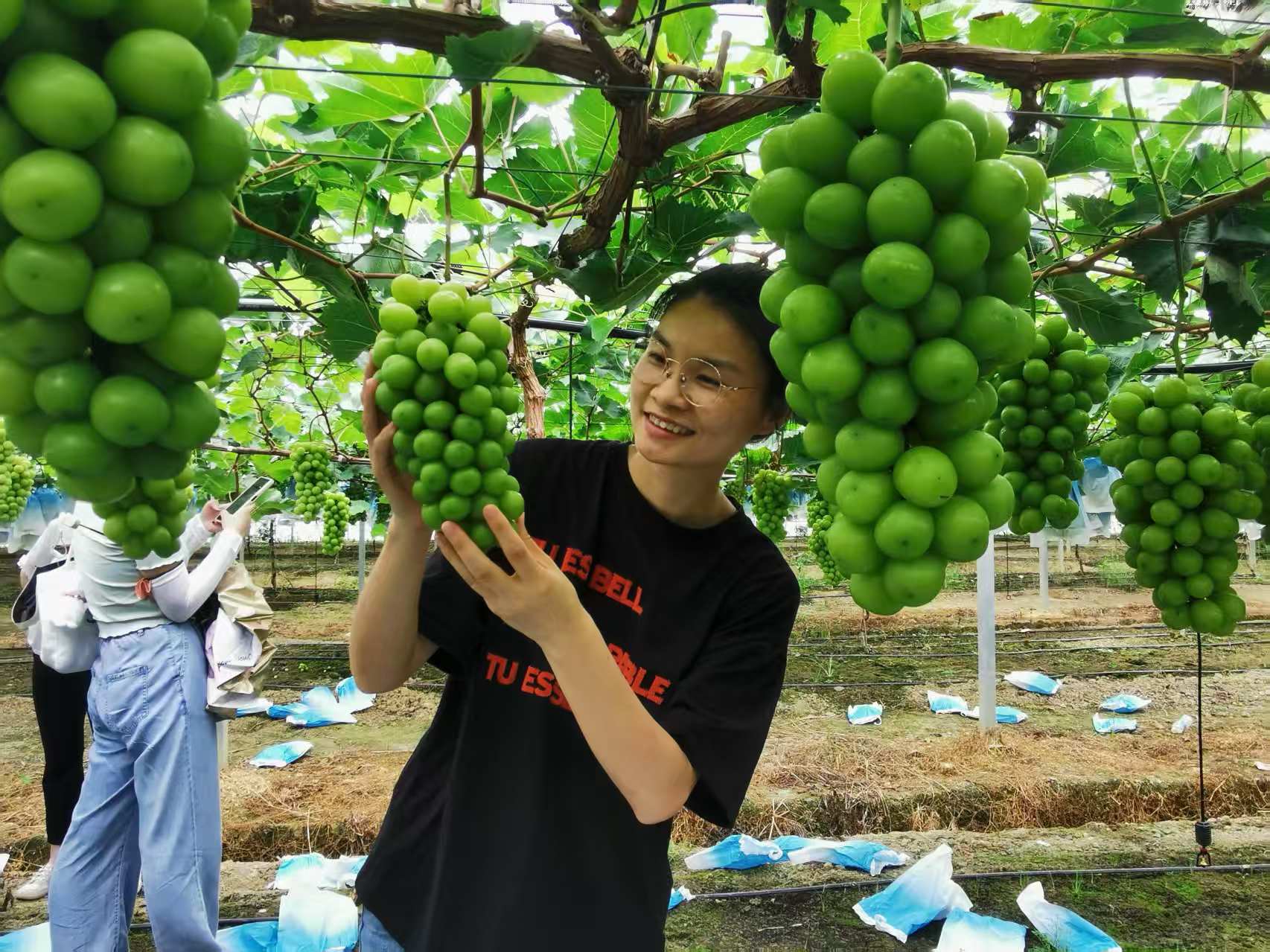 在果园里,葡萄架下的夏黑一串串倒架枝头,如黑珍珠般圆润可爱,香气诱人,引得游人采摘不断,笑声飞扬。“好大串、好香、好甜、爽爆了!”在村民游亚平100亩的葡萄园里,游客张女士与朋友一起拿着剪刀欢快采摘,体验之乐让她像小孩般欢呼雀跃。