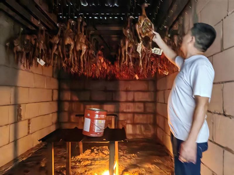 “新鲜的优质肉从亿丰大市场购来后,结合传统工艺和现代科技,配上唯一的佐料在冻库盐腌制15天,然后挂到熏制间用柴火熏烤至金黄即可。”公司负责人胡宝江详细介绍腊肉熏制工艺流程。