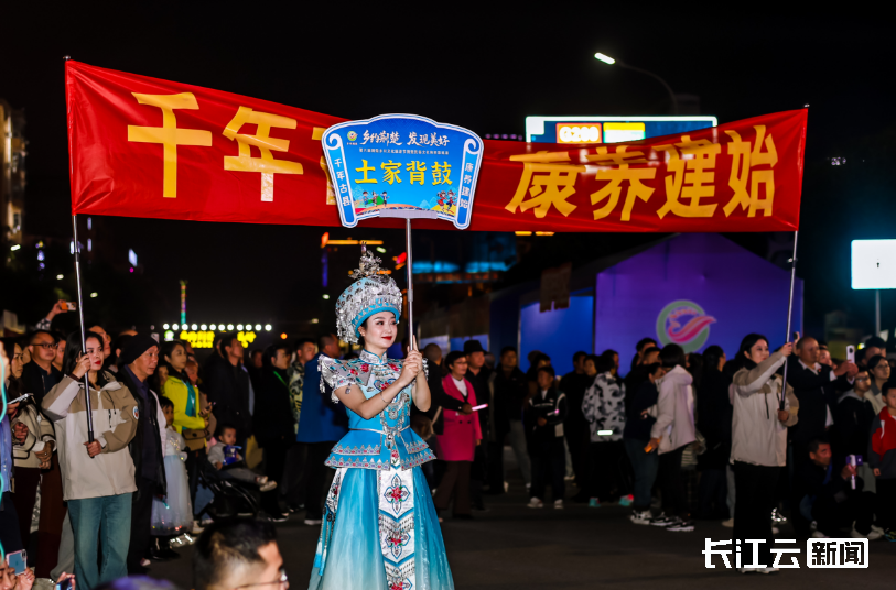 一河三域,灯火共歌。2日晚上,依托兴隆老街、贡水河栈道、文澜桥等宣恩自然与人文实景,来自湖北各地的表演类非遗项目与民俗文化展演,面向游客打造行进式踩街巡游体验,呈现了一场具有地域特色与文化交融的民俗表演。