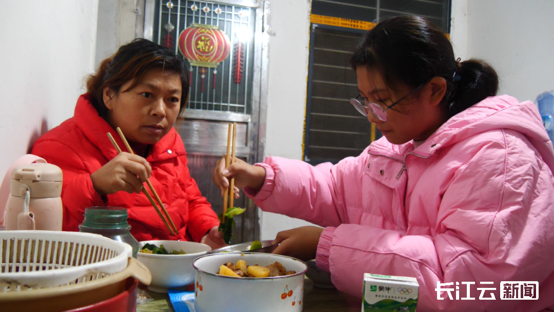“再夹一块肉,来,莫夹多了,一会儿扒不到饭……”饭桌上,周宇美细心为妈妈夹菜。妈妈失明的双眼朝着女儿的方向,脸上露出欣慰的笑容。