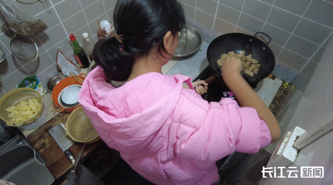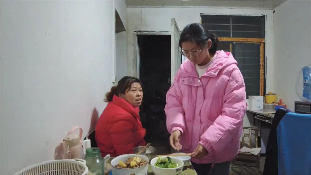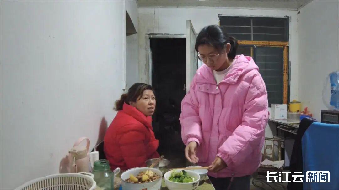 晚上八点,刚下自习的周宇美火速返回家中,和妈妈万永爱一起准备晚餐,她负责择菜、蒸饭、掌勺,妈妈则在一边切菜。很快,在母女俩熟练又默契的配合下,热气腾腾的饭菜端上了桌。