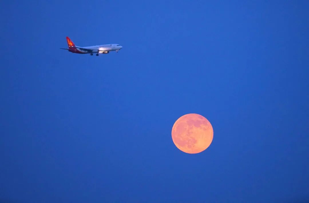 2025年10月11日,浙江省温州市,飞机与满月同框。新华社图片