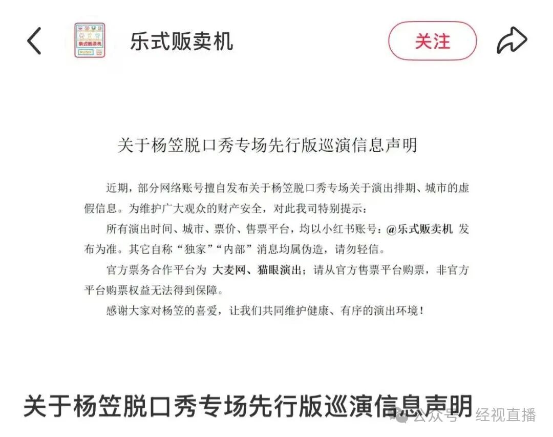 同日,“乐式贩卖机”发布关于杨笠脱口秀专场先行版巡演信息声明。部分内容如下: