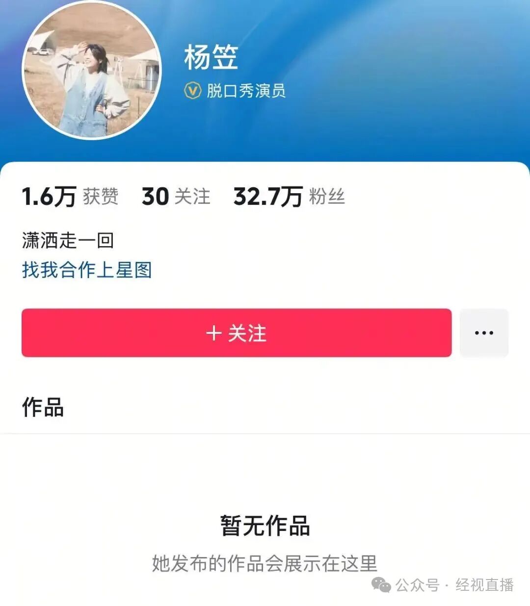 11月3日,据读秒财经报道,记者搜索发现,脱口秀演员杨笠的抖音已清空,主页暂无作品。数据显示,目前,杨笠粉丝数32.7万,获赞1.6万。