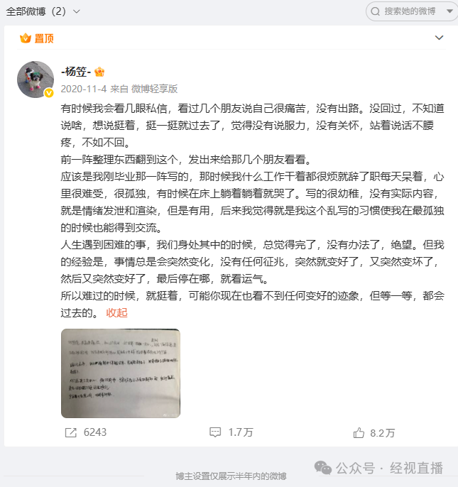 此外,杨笠的微博账号也仅1条动态可见,为2020年发布。