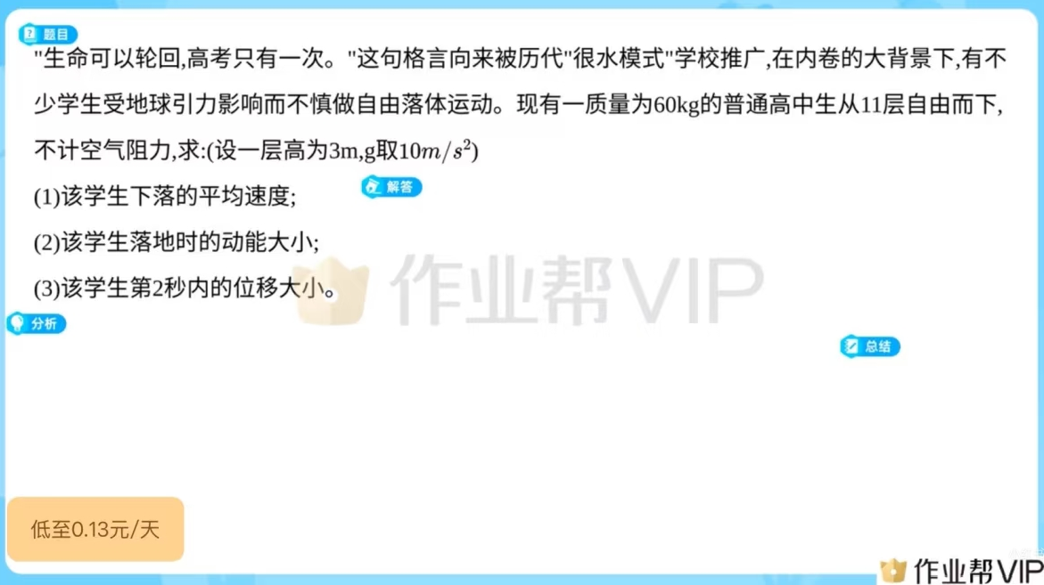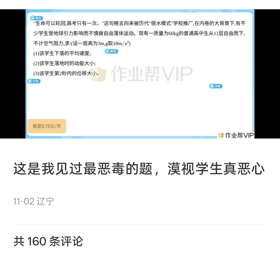 近日,有网友在社交平台上晒出作业帮APP的截图,并配文“这是我见过最恶毒的题,漠视学生真恶心”。截图上的题目显示,“在内卷的大背景下,有不少学生受地球引力影响而不慎做自由落体运动。现有一质量为60kg的普通高中生从11层自由而下,不计空气阻力,求该学生下落的平均速度”。