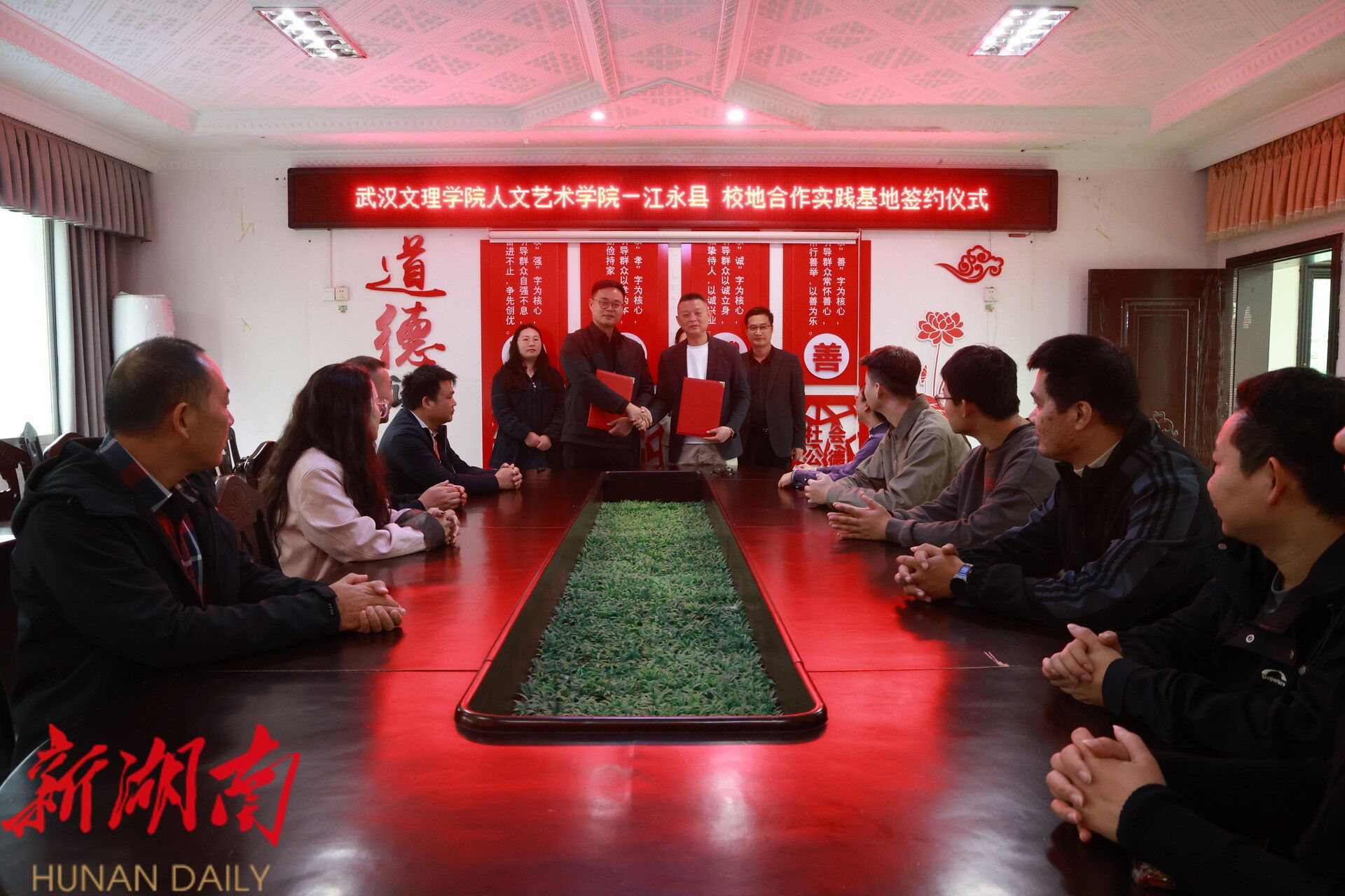 活动首站,学院与湖南鸣辰文化传媒在江永县青年创新创业基地共同为实践教学基地揭牌,标志着校地企三方合作正式启动。随后,师生考察兰溪勾兰瑶寨,结合专业特长对瑶寨文旅产业发展提出建设性意见,推动文化传承与创新发展。当日下午,校地合作实践基地签约仪式在兰溪政府举行,为人才培养和产业合作建立长效机制。