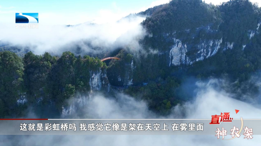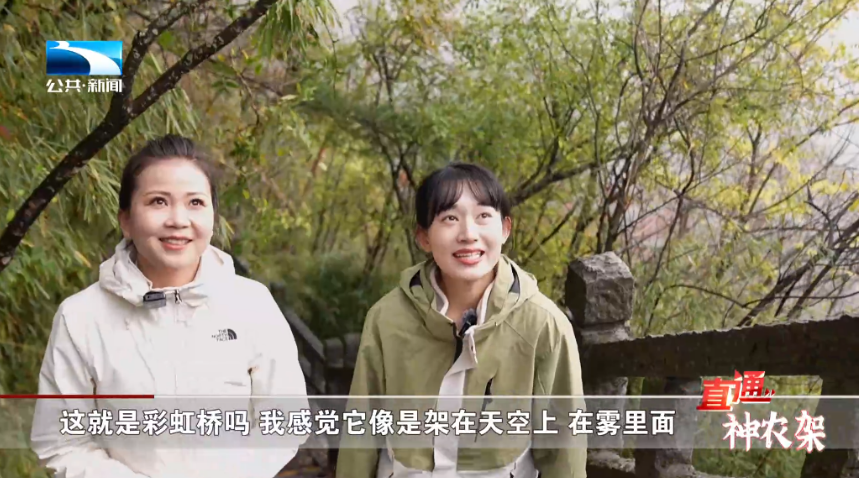 Hello!小敏姐,好久不见,好久不见。所以秋景到底在哪儿?别着急,我们往上走,我们现在觉得四周都是雾,走到上面往下看,感觉会不一样,这就是彩虹桥吗?我感觉它像是架在天空上,在雾里面,感觉很仙有没有。对。这就是这个地方的一个标志性建筑是亚洲地区海拔最高的观景桥,它叫云天飞渡,我们可以上去看看。