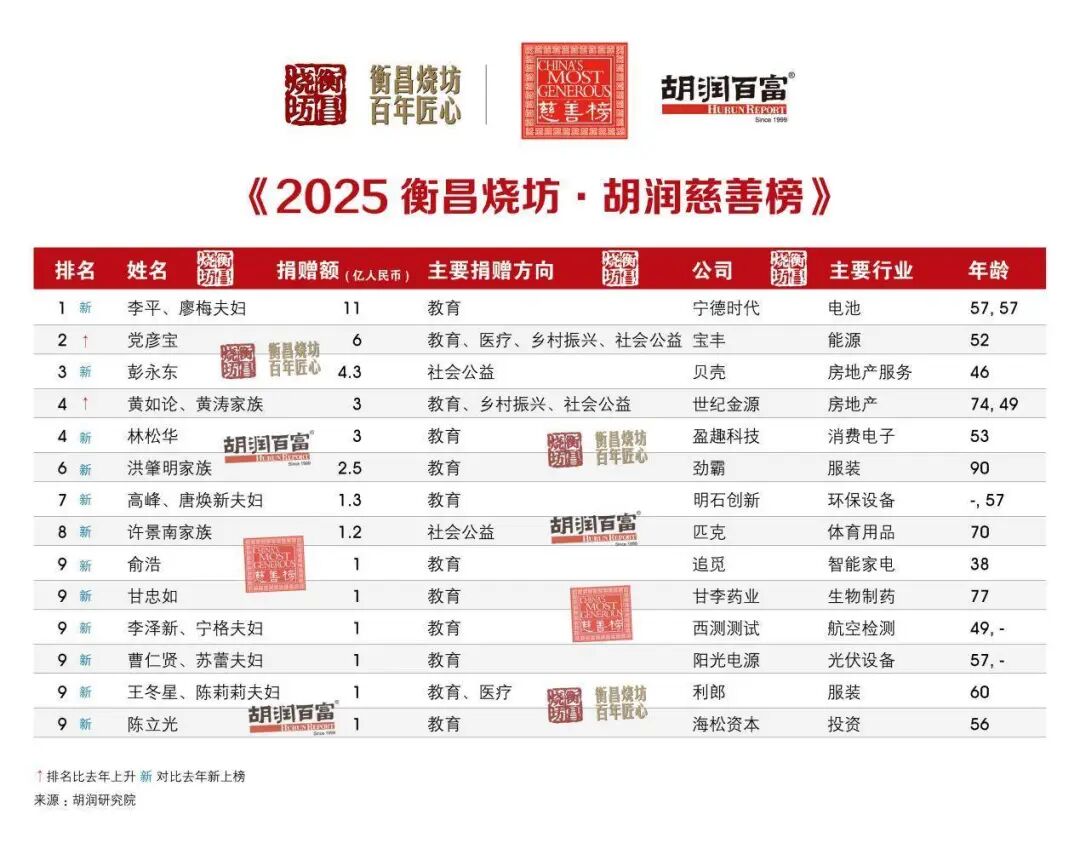 11月4日,胡润研究院发布《2025衡昌烧坊·胡润慈善榜》。榜单统计了2024年9月1日至2025年8月31日期间中国企业家及个人的现金、股权捐赠以及有法律效力的承诺捐赠,14位慈善家上榜。值得关注的是,在未计入本次榜单的大额捐赠中,华中科技大学获得一笔1.8亿元的校友匿名捐赠引发关注。