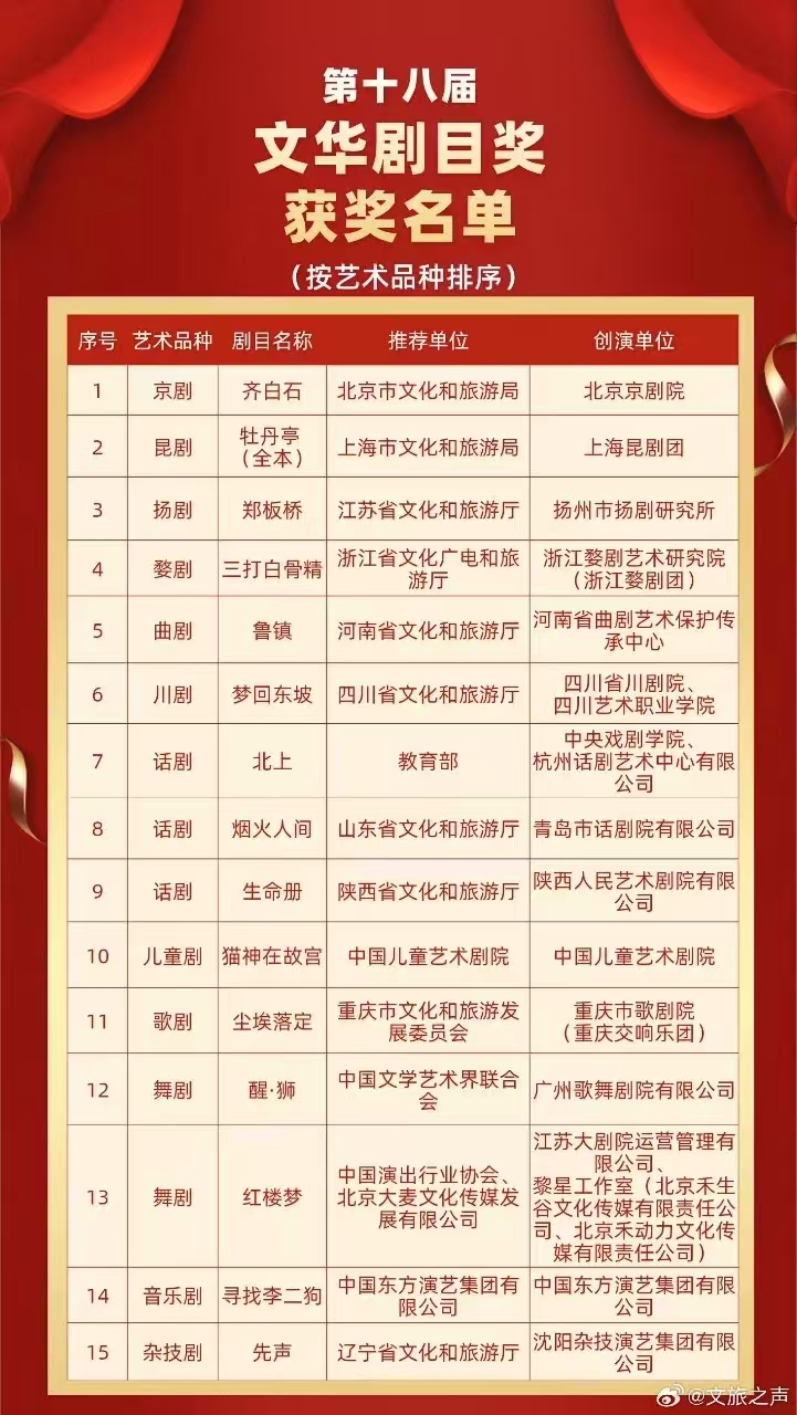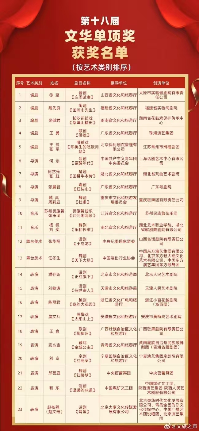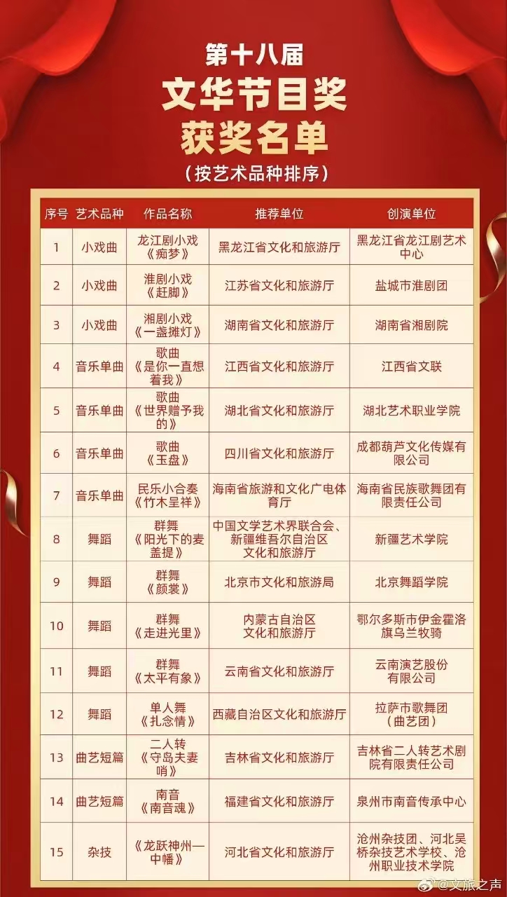 11月4日晚,第十四届中国艺术节在重庆闭幕,闭幕式上揭晓了第十八届文华奖获奖名单,并为55个获奖作品(含剧目奖、节目奖、单项奖)颁奖。湖北1部作品获本届文华奖节目奖,2部作品获本届文华奖单项奖(导演奖、音乐奖各1项)。