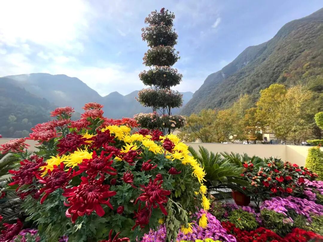 造型各异的菊花景观装点在步道两旁。粉的娇媚、红的炽烈、黄的明艳,“巨龙昂首”“孔雀开屏”“凤凰展翅”等一组组菊花扎景栩栩如生,与漫山秋叶互为映衬,构成一幅动人的峡谷秋景图。
