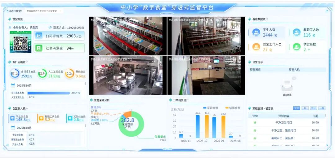 线上,孝昌县利用数字化手段,搭建起集食材、消费、财务、“互联网+明厨亮灶”四个子系统和AI智能分析模型于一体的校园“数字食堂”智慧监管平台,实现“供货、查验、入库、出库、盘存、加工、食品留样”全流程监管,打通校园食品安全监管“最后一米”。“家校食刻”家长监督二维码的推出,实现了家长监督一码参与、食堂信息一机可查、意见反馈一键直达。截至目前,仅关王小学就已收到家长评价2903条,“好评率”达94%以上。