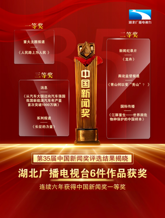 11月5日,中华全国新闻工作者协会公布第35届中国新闻奖评选结果。湖北广播电视台共有6件作品获奖,其中一等奖1件,二等奖3件,三等2件。这是湖北台连续6年获得中国新闻奖一等奖,在全国省级媒体中持续位居前列!