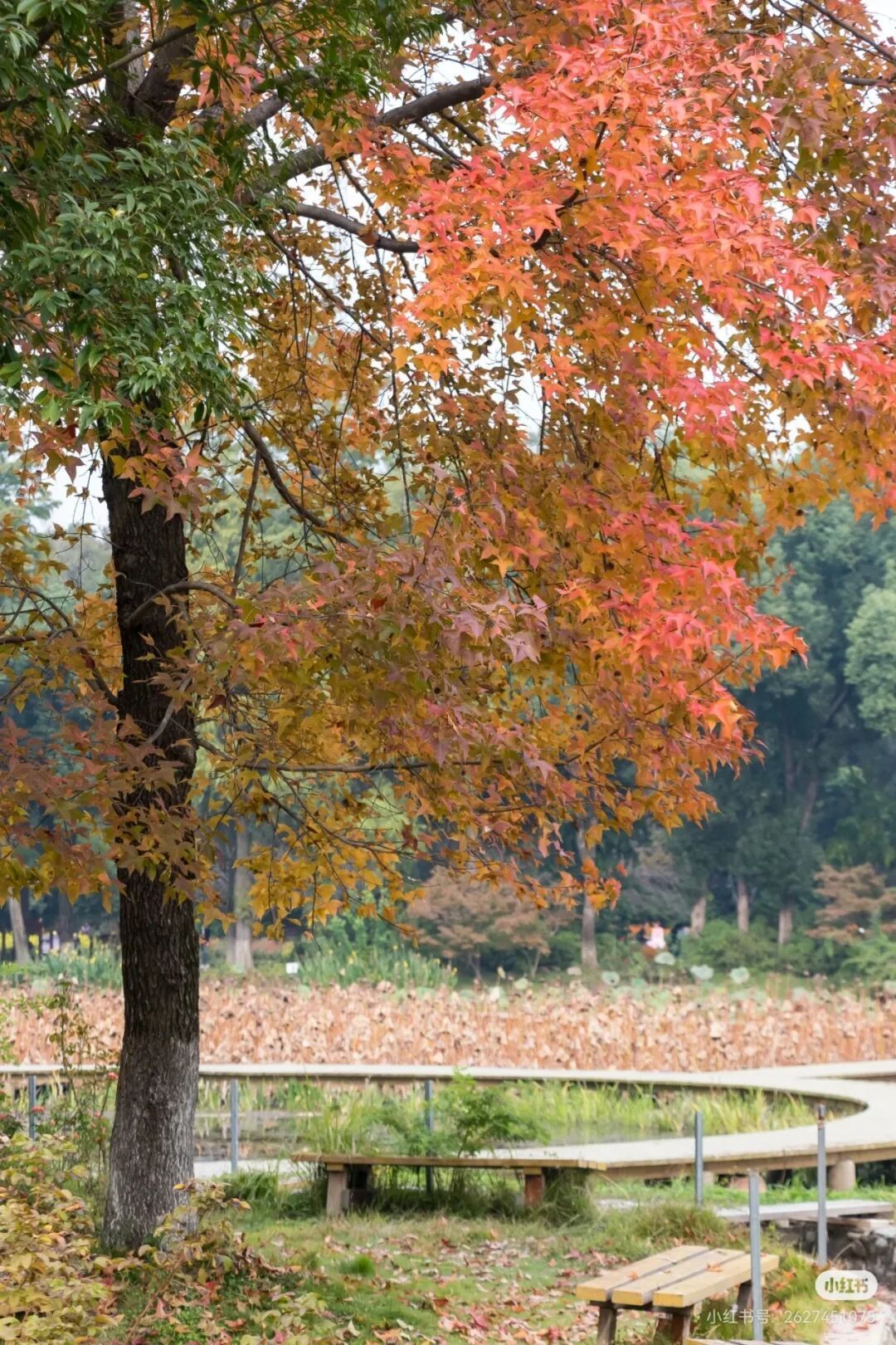 △中国科学院武汉植物园内,部分枫香红的比较早,形成了好看的渐变色(拍摄于2025年11月4日,图源@长生)