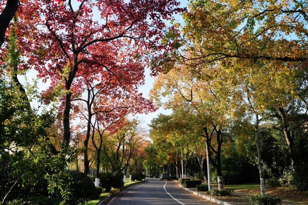 △春和路9号光谷希尔顿酒店入口,蜿蜒的小路上,一侧乌桕已经红头,一侧还是黄绿色(拍摄于2025年11月4日,图源@Lucine Ren)