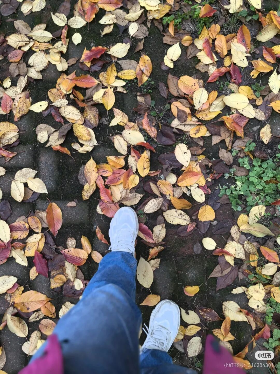 红的黄的落叶铺满草地