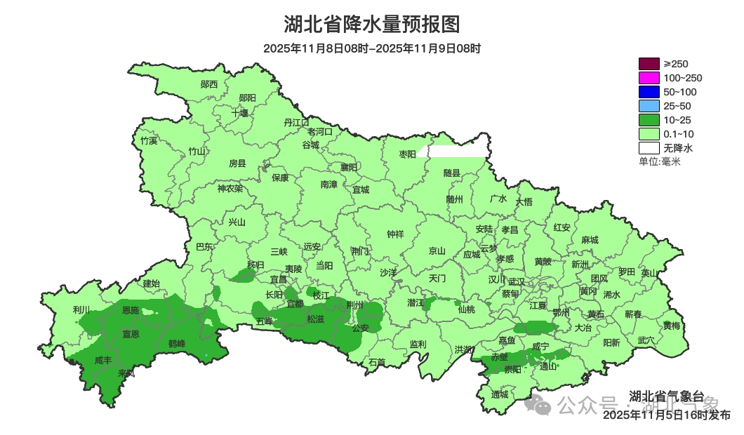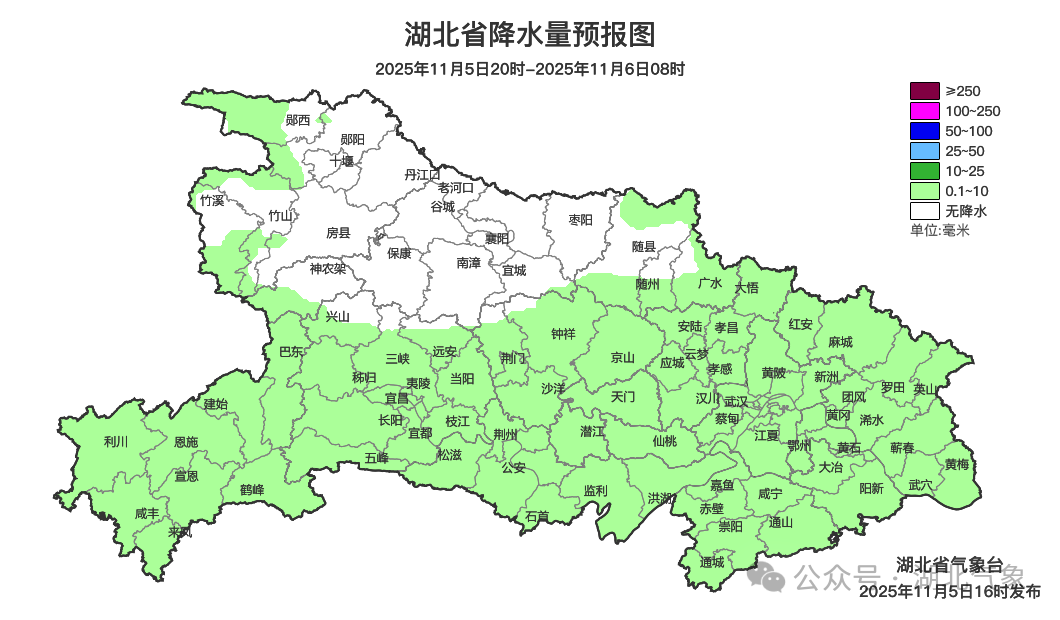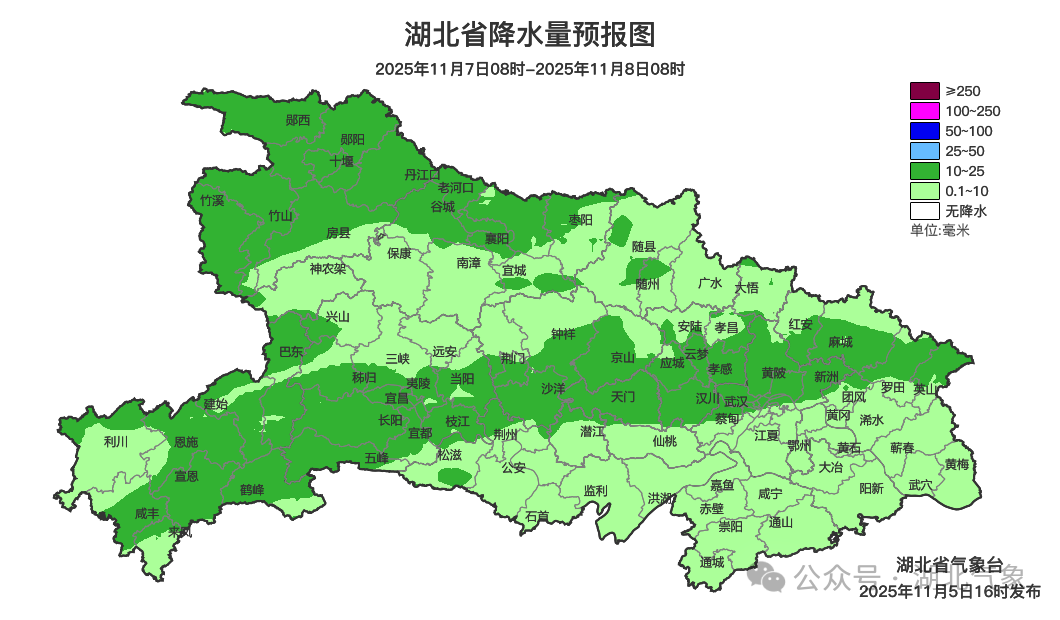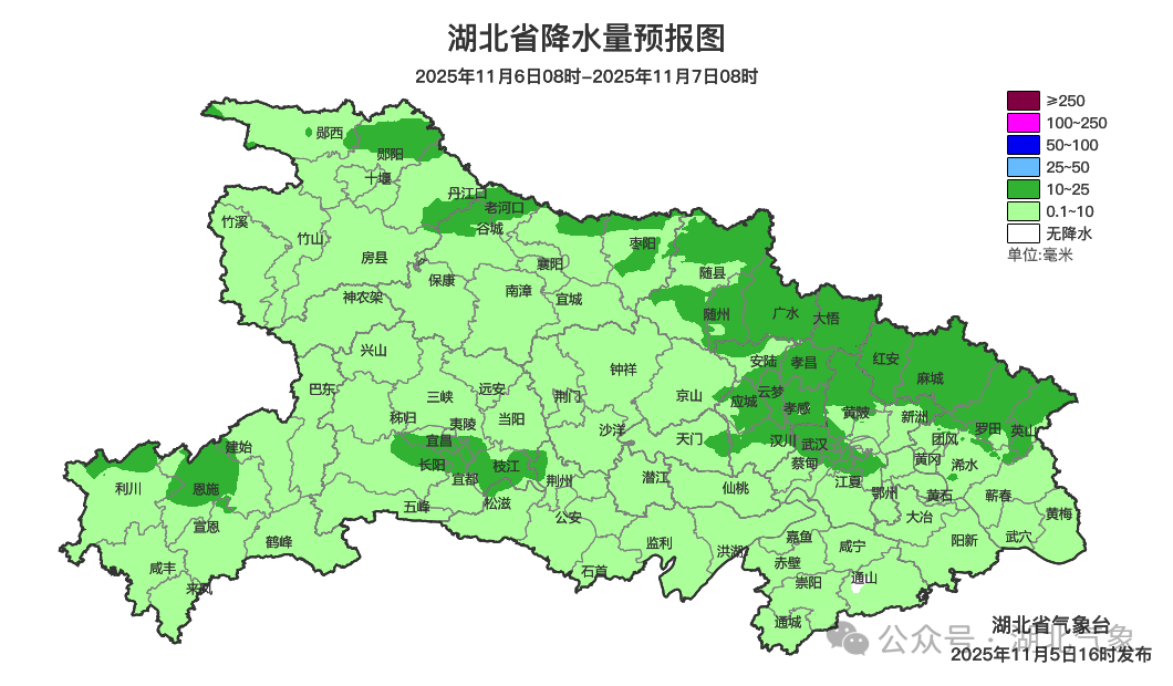 11月6日08时-7日08时,鄂东南小雨转阴天;其他地区阴天有小到中雨。最高气温西部13~16℃、中东部16~19℃,最低气温西部11~13℃、中东部13~15℃,偏北风2到3级。