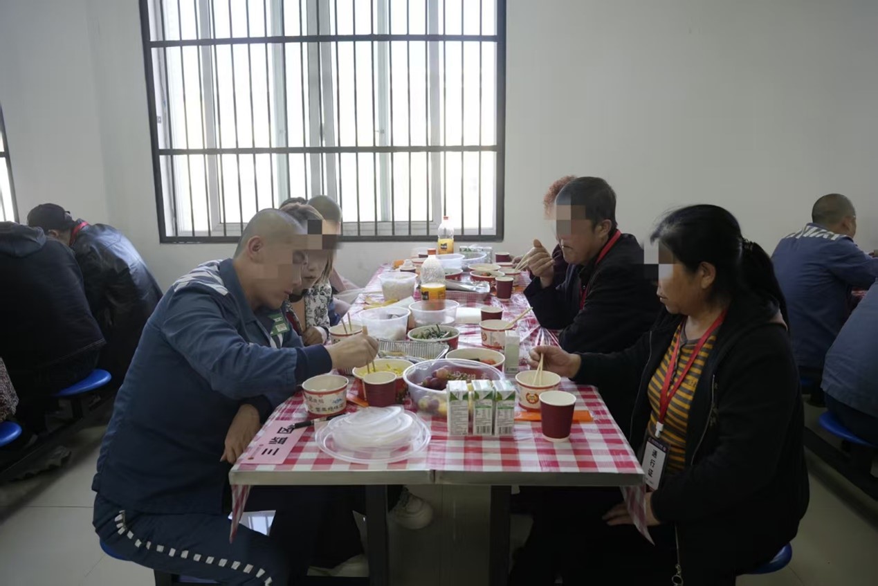 在“亲情共餐”环节,56名服刑人员与家属围坐一堂,泪光倒映着笑颜,温情冲淡了秋意。服刑人员秦某抱着素未谋面的儿子,激动得说不出话,年幼的孩子吃着父亲剥的香蕉,眼神懵懂清澈。秦某父亲哽咽道:“孩子我带着,就等你回家。” 服刑人员陈某见到从贵州远赴而来的女儿,泪流满面:“上次见面,你还在读小学,现在都是初中生了。” 服刑人员吴某与妻子紧握双手,妻子满眼期待:“还有一年就能回来了,我会把家照顾好的。”