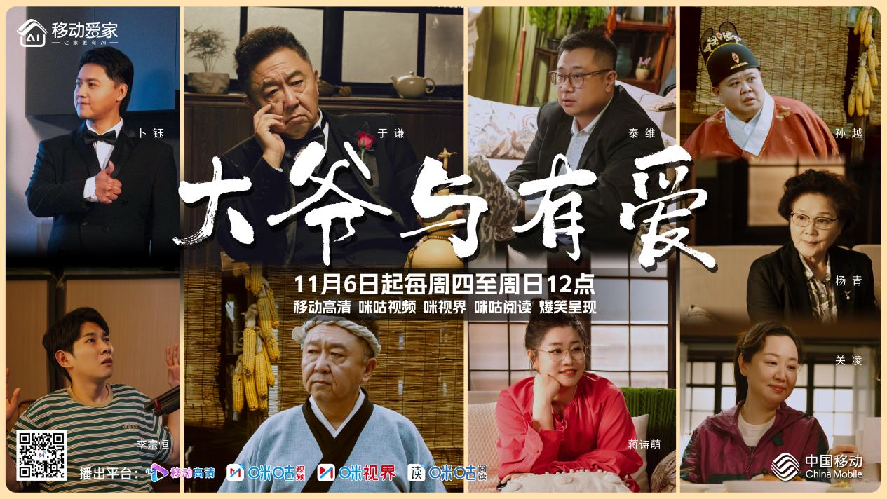11月6日,中国移动移动爱家定制奇幻生活短剧《大爷与有爱》正式登陆移动高清、咪咕视频、咪视界、咪咕阅读等平台。本剧由中国移动“移动爱家”独家定制,于谦、蒋诗萌、泰维领衔主演,孙越、李宗恒、关凌、杨青、卜钰、曹贺军、童飞、周英俊、刘宏禄等特邀主演,聚焦当代家庭生活,从退休大爷于有艾(于谦 饰)的视角切入,通过一系列奇幻色彩的爆笑故事,以不同代际间跨越年龄的双向互动,引发观众对当下生活与爱的深度思考。