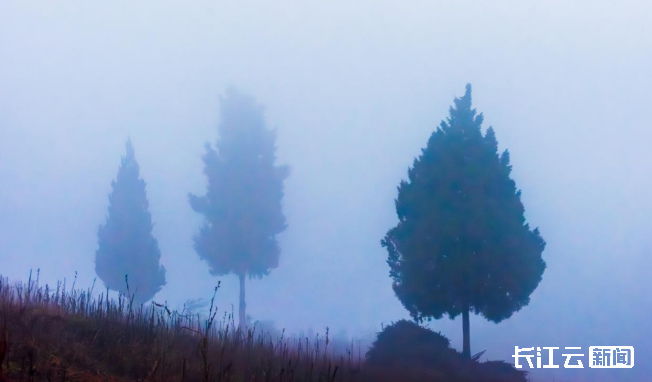 近处的树林,变成了深浅不一的墨痕,枝叶的细节被雾气柔化,仿佛整个世界都被打上了温柔的“虚化”滤镜。