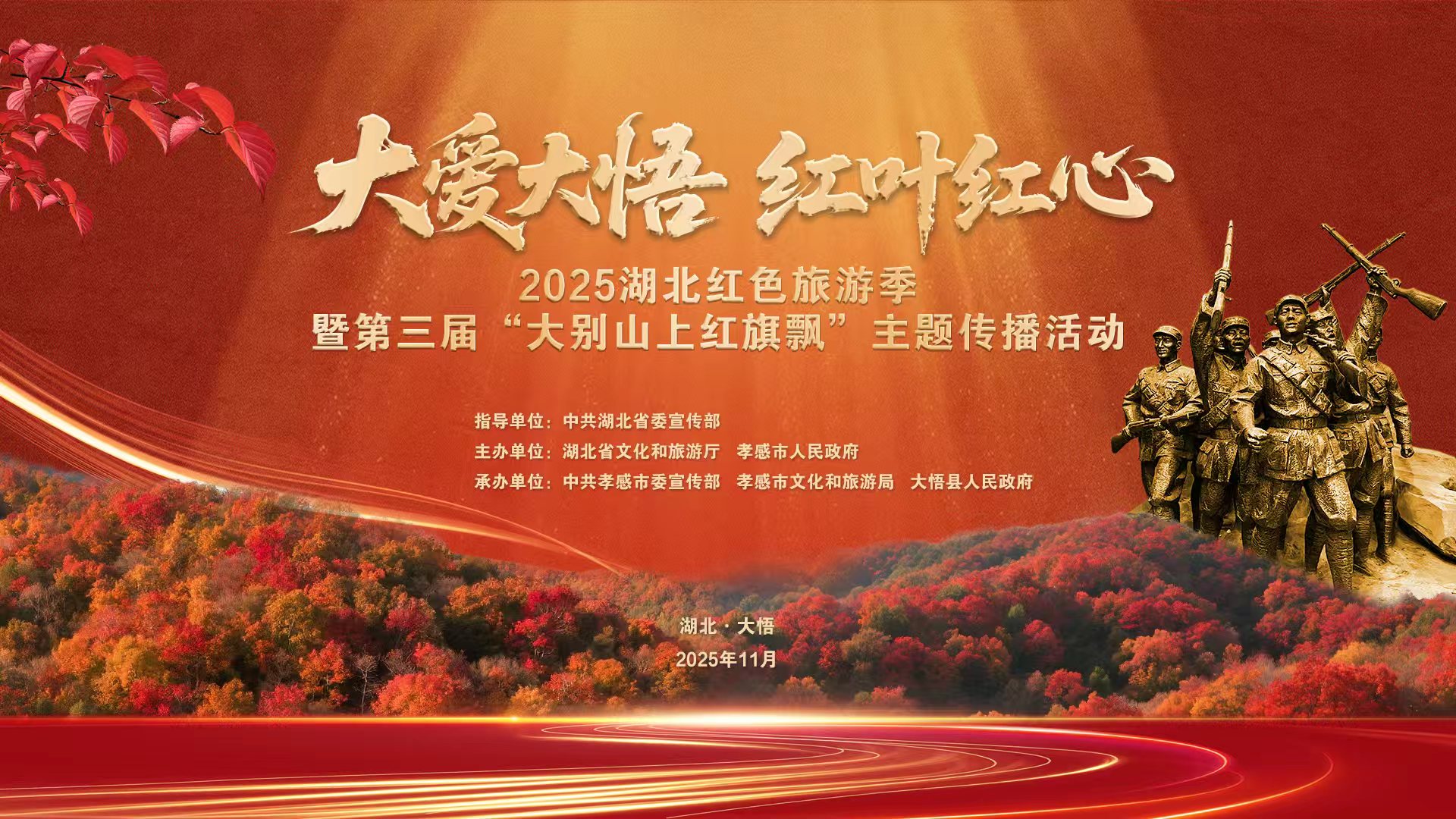 大爱大悟 红叶红心。由湖北省文化和旅游厅、孝感市人民政府主办的2025湖北红色旅游季暨第三届“大别山上红旗飘”主题传播活动于2025年11月8日14:30在湖北省大悟县中原军区旧址景区举行。